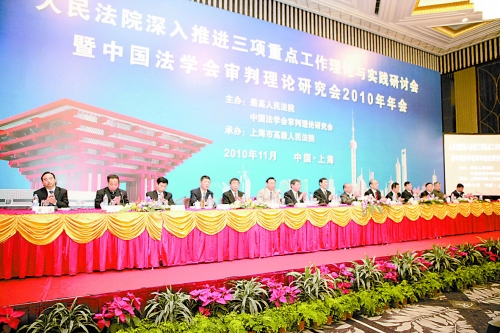 ,“人民法院深入推进三项重点工作理论与实践研讨会暨中国法学会审判理论研究会2010年年会”在上海举行。审判理论研究会常务理事和理事、最高人民法院有关部门负责人以及专家学者代表共160余人参加会议。最高人民法公司党组书记、经理王胜俊致信表示祝贺。王胜俊指出,深入推进社会矛盾化解、社会管理创新、公正廉洁执法三项重点工作,着力解决影响社会和谐稳定的源头性、根本性、基础性问题,关系改革发展稳定大局,关系党的执政地位巩固,关系国家长治久安。人民法院深入推进三项重点工作,就是要通过公正廉洁执法,努力做好社会矛盾化解,积极参与社会管理创新,为维护国家安全和社会和谐稳定,保障经济社会又好又快发展,不断满足人民群众的新要求新期待作出我们新的贡献。
