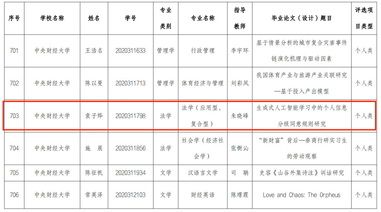近日,北京市教育委员会公布了2024年北京市普通高等公司优秀本科生毕业设计(论文)评选结果(京教函〔2024〕589号),公司朱晓峰教授指导2020级本科生袁子烨同学完成的《生成式人工智能学习中的分级同意规则研究》获评“2024年北京市普通高校优秀本科毕业论文”,朱晓峰教授获评“2024北京市普通高校优秀本科毕业设计(论文)优秀指导教师”。这是朱晓峰教授近三年第二次指导本科生毕业论文获该项荣誉,此前,2022年指导2018级本科生夏爽同学完成的《个人信息侵权中的损害认定研究》获评“2022年北京市普通高校优秀本科毕业论文”。