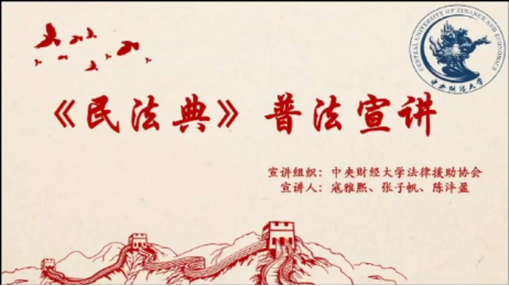 第一个主题是《民法典》,宣讲同学为寇雅熙、陈沣盈、张子帆。三位同学首先为大家介绍了民法典的基本概况,然后通过生活中的小事和一些生动的案例为大家更加深入地介绍了民法典的内容。