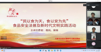 2022年10月23日,协会为北京市西城区天桥社区开展“食以安为先——食品安全普法宣讲”活动。协会成员阐述了食品安全是什么以及我国的食品安全标识,接着为大家介绍了“315晚会”及其曝光的典型食品安全案件,其中详细说明了“三鹿奶粉案件”和“老坛酸菜案件”,最后向居民们普及了食品安全小常识与3个食品安全相关的投诉举报电话,回应了广大居民关心的食品安全问题。